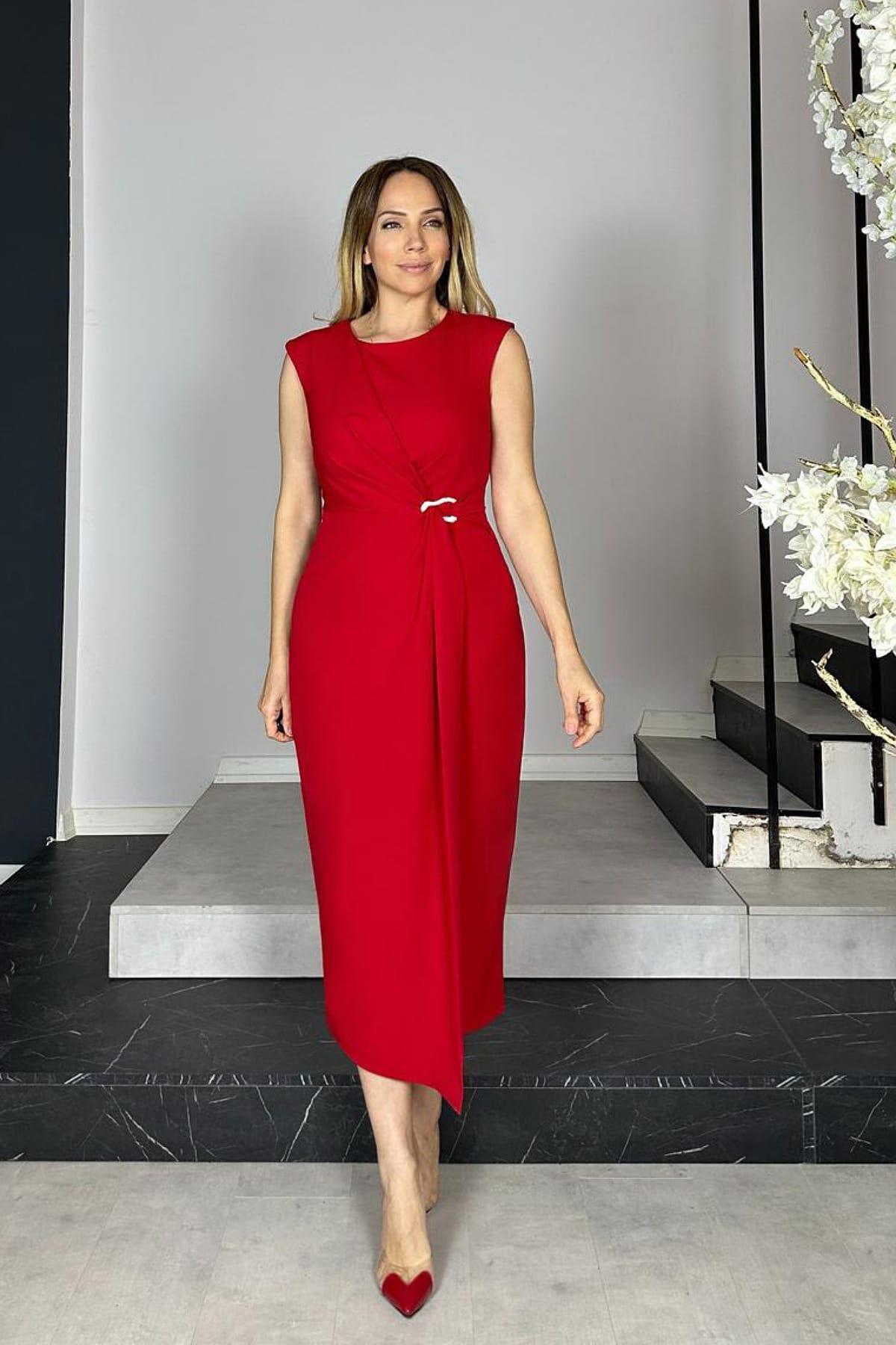 G1369 Broş Detaylı Tasarım Elbise Kırmızı (21KKDEL147002)